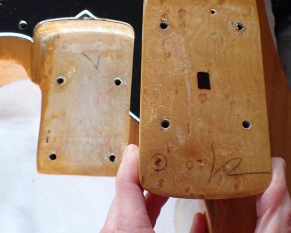 The original white blond was long gone and the body had an old refinish in clear varnish. Some of the original white blond was still present in the control cavity.