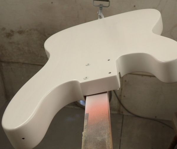 We continued working on the body and applied the semi opaque white blond nitro, followed by some 'age tint' lacquer coats, which, once dry would be given a faded aged look in keeping with the overall look of the rest of the bass/parts etc.