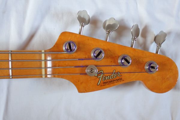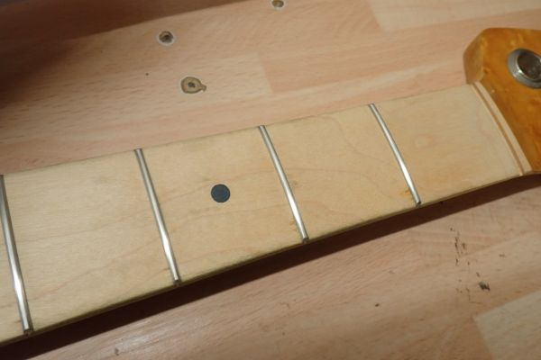 The neck was beautifully figured birdseye maple with a plain maple cap fretboard which had some dark wear/staining. The neck back had some 'overspray'. The frets were non original, very flat and worn.