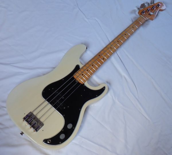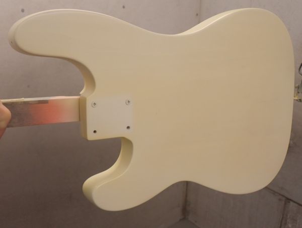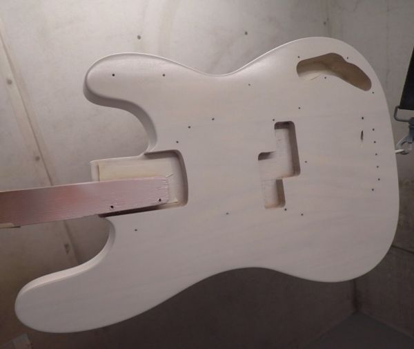 We continued working on the body and applied the semi opaque white blond nitro, followed by some 'age tint' lacquer coats, which, once dry would be given a faded aged look in keeping with the overall look of the rest of the bass/parts etc.