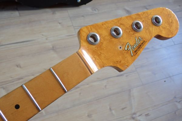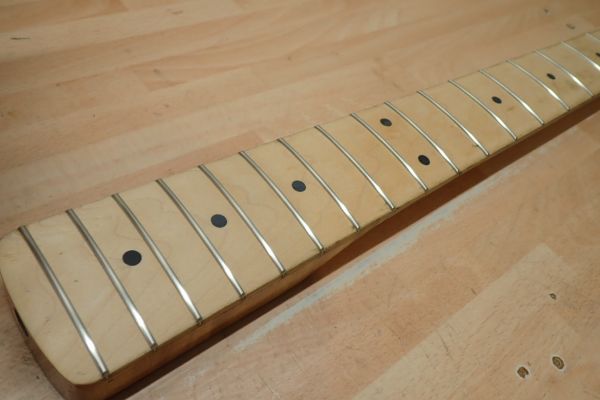 The neck was beautifully figured birdseye maple with a plain maple cap fretboard which had some dark wear/staining. The neck back had some 'overspray'. The frets were non original, very flat and worn.